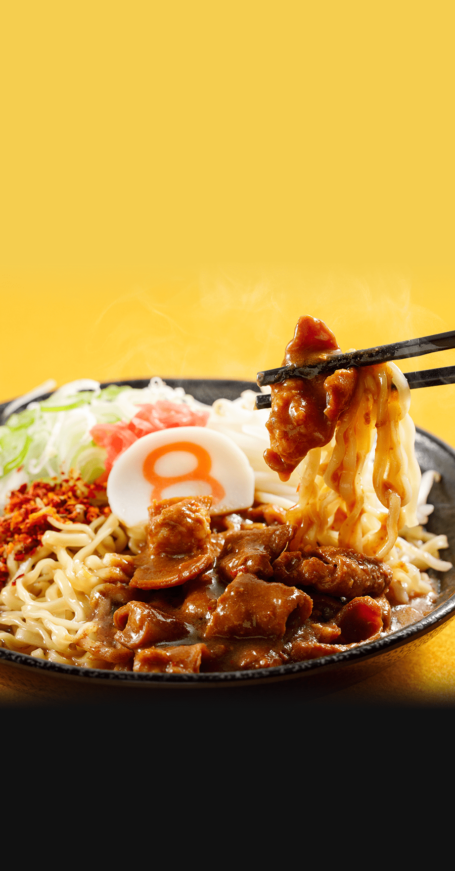 じっくり煮込んだ牛もつ煮の旨みが、8番定番のシャキシャキ野菜と太麺によく絡み、味噌スープに溶け込む!寒さが増すこの時期に食べたい、味わい深い一杯です。