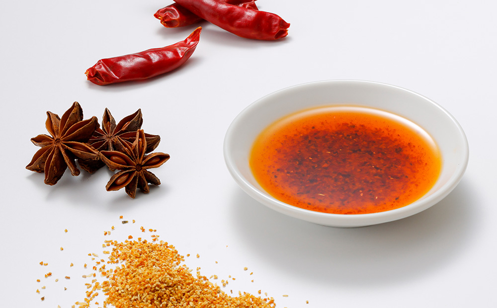 辛みを抑えた唐辛子、八角、陳皮など厳選した7種の香辛料とごま油が華やかに香るピリ辛香辣油を、