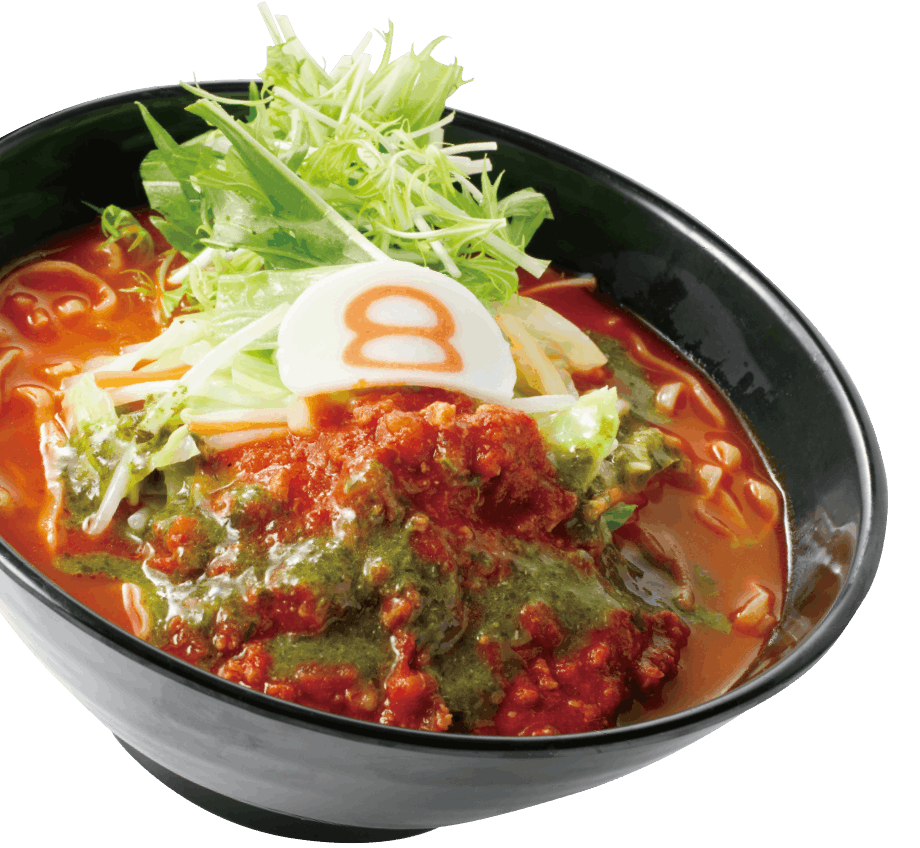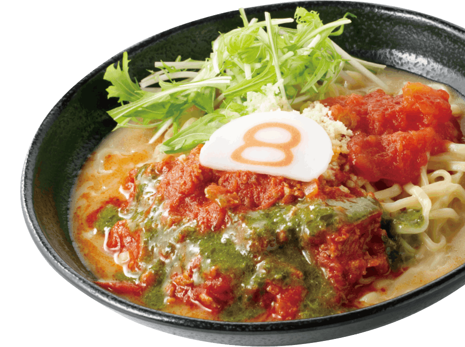 爽やかな特製レモンソースは、フレッシュなバジルソースに合わせて、8番らーめんの唐麺には全く新しい、春らしくさっぱりと仕上げました。8番の太麺を混ぜてふわっと広がる爽やかな香りが特徴です。